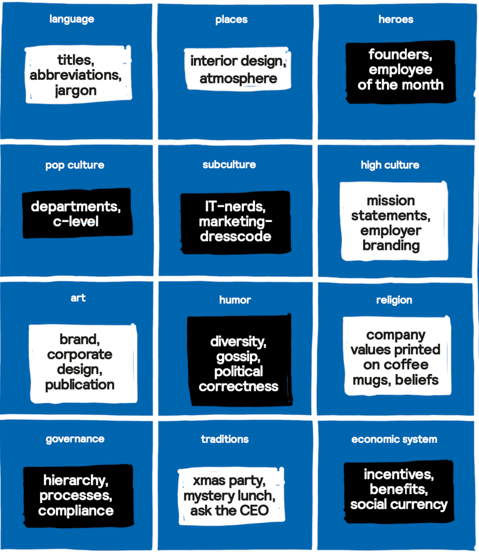 Making culture tangiable is the firt step. Great, if you want to communicate what your organization feels like to the external world or new hires. But more often than not, exploring your culture brings up some issues which you want to transform into a more preferable state than the staus quo. Problem is: you don’t change culture through stickers, emails & memos. You change it through relationships … one conversation at a time. That’s why we designed group activities, games, role plays for each of the culture elements (language, places, hereos, humor etc.) that offer a playful reflection of team culture while co-creating interesting cultural artefacts that serve as portrait of the lived culture for communication. The group activity itself is designed as an intervention in which a joint experience sets the foundation for living into a more preferable culture.